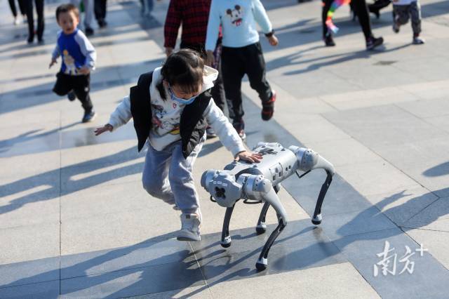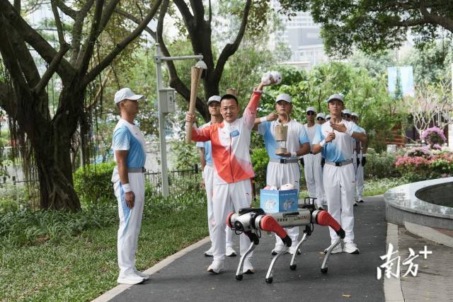 11月2日上午,十五运会火炬传递活动上“机器狗”现身深圳,将全运会吉祥物交给火炬手。